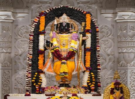 The temple's pillars and walls showcase intricately sculpted depictions of Hindu deities, Gods, and Goddesses. In the main sanctum sanctorum on the ground floor, the childhood form of Bhagwan Shri Ram (the idol of Shri Ramlalla) has been placed.