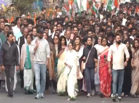 Adding both star power and organisational heft to the rally were actor-politicians Dev, a sitting Lok Sabha MP, and Soham Chakraborty, along with other familiar faces from the Bengali film and television industry, who now double as party representatives. Their presence drew cheers and whistles, blurring the line between cinema and politics that the TMC has increasingly embraced.