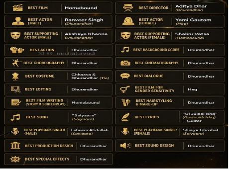 Among other winners, Akshaye Khanna and Shalini Vatsa won supporting acting honours for Dhurandhar and Homebound, respectively, while Gulzar and Shreya Ghoshal were among the key music award winners, as per the press release.