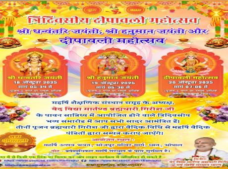 भोपाल [ महामीडिया] प्रतिवर्ष की भांति इस वर्ष भी महर्षि संस्थान में दीपावली महोत्सव पर्व का आयोजन किया जा रहा है। महर्षि शैक्षणिक संस्थान समूह के अध्यक्ष वेद विद्या मार्तंड ब्रह्मचारी गिरीश जी के पावन सानिध्य में आयोजित होने वाले इस भव्य समारोह में ब्रह्मचारी गिरीश जी महर्षि वैदिक पंडितों के साथ मिलकर वैदिक विधि विधान के साथ पूजा अर्चना करेंगे। आज प्रथम दिवस 18 अक्टूबर को श्री धन्वंतरि जयंती पूजन शाम 5:34 मिनिट पर प्रारंभ होगा। द्वितीय दिवस 19 अक्टूबर को श्री हनुमान जयंती पूजन शाम 5:30 मिनिट से प्रारंभ होगा। ठीक किसी तरह दीपावली महोत्सव 20 अक्टूबर को शाम 7:06 मिनिट से प्रारंभ होगा। यह तीन दिवसीय दीपावली महोत्सव राजधानी भोपाल के भोजपुर मंदिर मार्ग स्थित छान के महर्षि उत्सव भवन में किया जाएगा। इस दीपावली महोत्सव कार्यक्रम का लाइव प्रसारण रामराज टीवी के वेबसाइट, यूट्यूब एवं फेसबुक चैनलों पर भी किया जाएगा जो श्रद्धालु किसी कारणवश आध्यात्मिक कार्यक्रम में उपस्थित होकर शामिल नहीं हो सकते वह ऑनलाइन माध्यम से जुड़कर भी धार्मिक कार्यक्रम में सहभागिता कर सकते हैं।