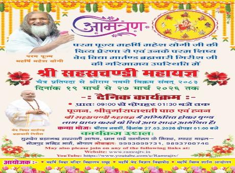 भोपाल [महामीडिया] परंपरा के अनुसार महर्षि महेश योगी संस्थान में 19 मार्च को चैत्र नवरात्र से 27 मार्च रामनवमी के दिन तक श्री सहस्त्र चंडी महायज्ञ का आयोजन किया जा रहा है।