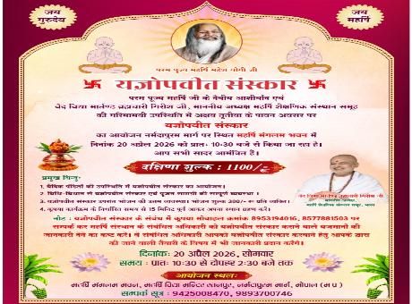 इसी को ध्यान में रखते हुए महर्षि महेश योगी संस्थान में महर्षि संस्थान के प्रमुख वेद विद्या मार्तंड ब्रह्मचारी गिरीश जी की गरिमामय उपस्थिति में अक्षय तृतीया के पावन अवसर पर यज्ञोपवीत संस्कार का आयोजन किया जा रहा है। इसमें महर्षि संस्थान के वैदिक पंडितों द्वारा वैदिक विधि विधान के साथ बच्चों का यज्ञोपवीत संस्कार किया जाएगा जो भी व्यक्ति इस कार्यक्रम में अपने बच्चों का यज्ञोपवीत संस्कार करवाना चाहते हैं वह ₹11,00 दक्षिणा शुल्क देकर संपर्क स्थापित कर सकते हैं ।