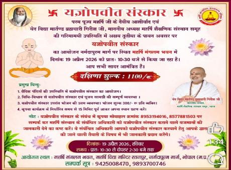 BHOPAL [Maha Media]: The Maharshi Mahesh Yogi Sansthan is set to organize the Upanayan Sanskar, also known as the sacred thread ceremony or Vratabandha, on April 20, 2026. This significant event will take place at the Maharshi Mangalam Bhawan within the Maharshi Vidya Mandir campus in Ratanpur, Bhopal. Held under the distinguished presence of Ved Vidya Martand Brahmachari Girish Ji, the head of the institute, the ceremony is scheduled to run from 10:30 AM to 2:30 PM. The ritual carries deep spiritual and scientific weight in Hindu tradition, marking the transition of a young boy into a life of discipline and Vedic learning. The Yagyopavita thread itself consists of three strands that symbolize the fundamental debts a person owes to the divine, their ancestors, and the sages. Beyond its religious roots, the practice of wrapping the thread around the ear is recognized for its potential to stimulate specific nerves that aid in memory and concentration. This transition is historically regarded as the official start of the Brahmacharya Ashram, fostering qualities of self-control, purity, and responsibility to help mold children into cultured citizens. Families interested in enrolling their children for this Vedic initiation can do so by contributing a Dakshina fee of Rs 1,100. The Sansthan’s Vedic pundits will conduct the rites according to traditional laws on this auspicious day, leading up to Akshaya Tritiya. For registration and further details, the institute has provided contact numbers 9425008470 and 989370046 for public inquiries. This ceremony not only represents a significant cultural tradition but also aligns with the Sansthan's mission to enhance spiritual growth and contribute to global peace through practices like Transcendental Meditation.
